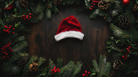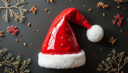 A vibrant red Santa hat with a fluffy white brim and pom-pom sits atop a dark surface, surrounded by festive decorations. The scene is adorned with pine branches, colorful ornaments, and delicate snowflakes, evoking a joyful holiday spirit.