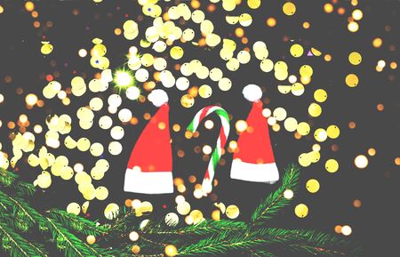 Santa hats and caramel cane on black background with sparkles. New Year mood.Close-up, copy space.