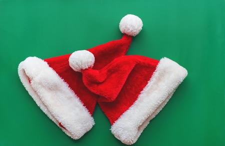Christmas card two red Santa Claus's hat with white pompon green backdrop.