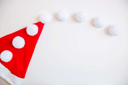 Santa Claus hat and lots of white balls on a white background. Christmas flat layout with space for text. High quality photo