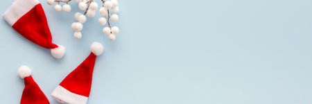 Santa Claus hats and rowan branches on a blue background, Christmas background, Merry Christmas and Happy New Year banner, top view, copy space