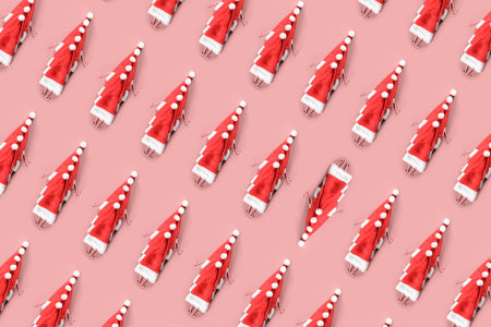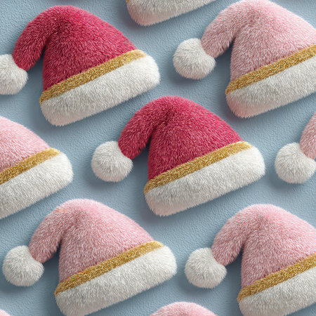 Delightful pattern featuring pink and red Christmas hats with warm fur accents. Perfect for holiday-themed designs, decorations, or festive fashion.