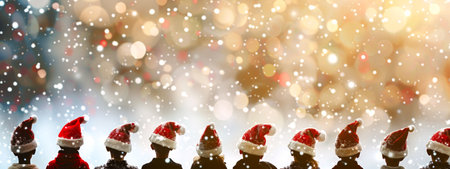 Multicultural People Wearing Santa Hats Viewed from the Back in a Snowy Setting for Concept of Holiday Celebration, Diversity, Christmas Spirit, Multicultural Unity. Copy space. Banner.