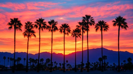 The sky is filled with striking colors as the sun sets behind a row of palm trees, casting silhouettes against distant mountains, creating a serene evening atmosphere.