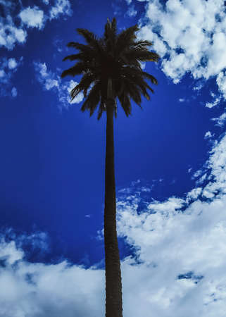 Vintage looking A tropical palm tree scientific name Arecaceae Palmae Palmaceae over blue sky