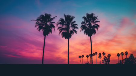 This image features silhouetted palm trees and architecture set against a gradient sky of orange, yellow, and blue. The composition, utilizing negative space, creates a dramatic contrast, highlighting the shapes of the trees and buildings. Suitable for commercial and editorial purposes, the photograph suggests a warm environment.