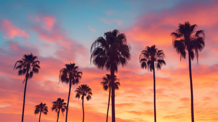 Silhouettes of palm trees against a vibrant sunrise sky, a scene of serenity and tranquility as nature awakens to the dawn.