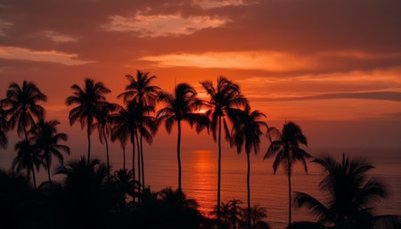 Silhouette of palm tree, vibrant sunset sky generated by artificial intelligence