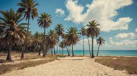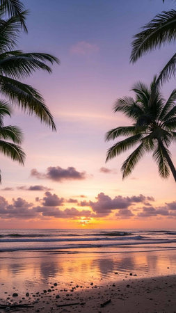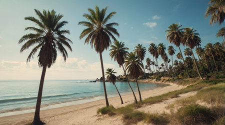 A tranquil beach scene featuring swaying palm trees, gentle ocean waves, and a vibrant sky. Ideal for relaxation and vacation imagery.