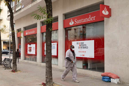 Madrid, Spain - Nov 25, 2020: Bank office open to the public, of Banco Santander in Narvaez street, corner with O'Donell