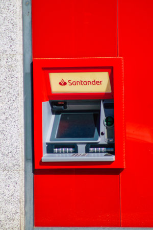 Spain, November 2021: ATM with the new Santander bank logo in Pozuelo de Alarcon, Madrid