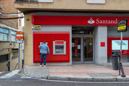 SEPULVEDA, SPAIN - SEPTEMBER 12, 2021: Santander bank branch office in Sepulveda, a medieval village in Castile and Leon, Spain. Santander is a Spanish bank founded in 1857
