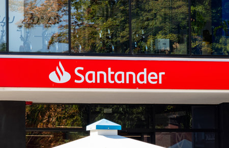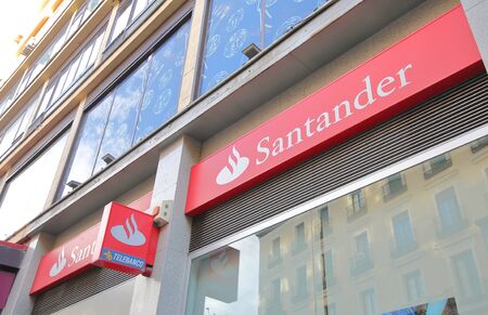 MADRID, SPAIN - NOVEMBER 23, 2019. Santander logo on Santander bank office. Santander is a spanish bank founded in 1857