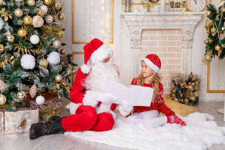 Santa Claus reads a book to a child girl at the Christmas tree, the concept of new year and Christmas