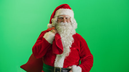 Studio Shot Isolated Mockup Template: Jolly Santa Claus Standing On Green Screen Chromakey Background And Holding Bag With Gifts, Looking at Camera. Christmas, New