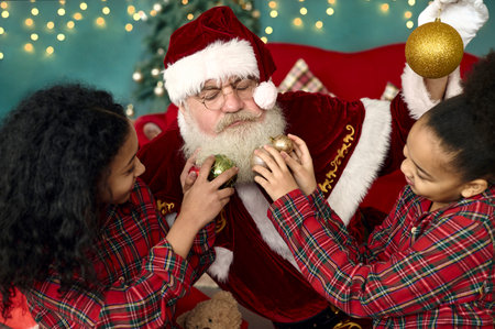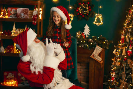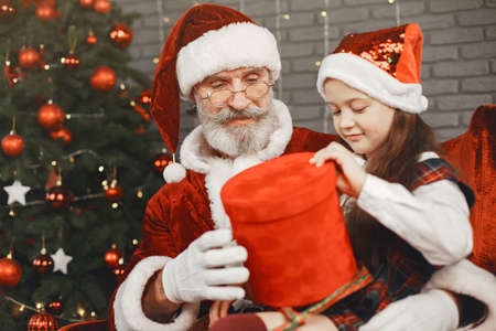 Santa Claus with a little cute girl play in the room. Christmas time.