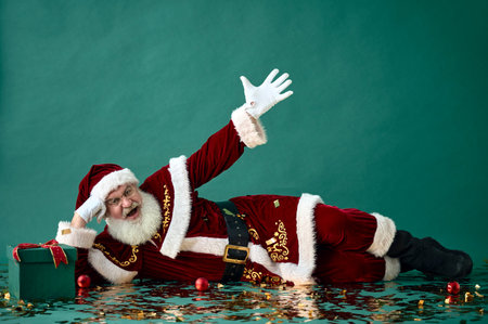 Funny Santa Claus wearing red costume adjusting glasses while standing over black background