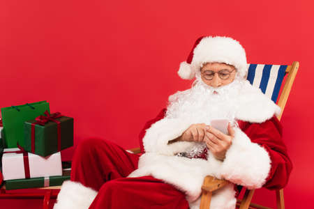 Santa using smartphone on deck chair near presents on sleigh on red background