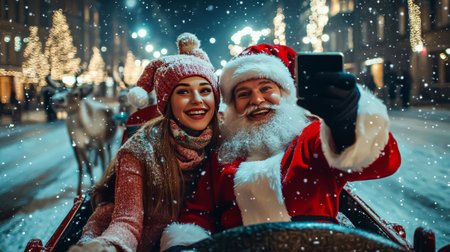 Santa claus hand pointing in festive holiday park with christmas tree and archway lights. concept of holiday spirit, christmas celebration, festive season magic.