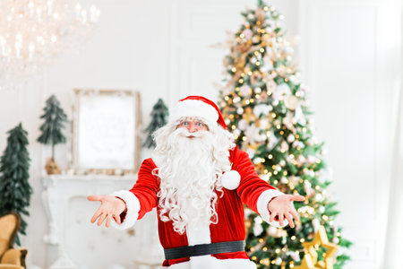 Happy Santa Claus indoors near christmas tree carrying no gifts to children