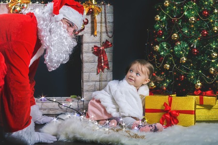Santa and cute toddler girl near the fireplace and decorated Christmas tree. New Year 2017. Dressed in fashion fur coat