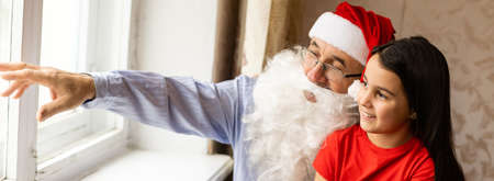 Close-up portrait of joyful girl hugging grandpa in headwear. grandfather and granddaughter in Santa Claus hats