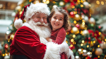 Caucasian Santa Claus Embracing Smiling Child Girl by Christmas Tree in Holiday Shopping Mall. Concept of Holiday Cheer, Family Bonding, Festive Celebrations, Cultural Representation. Copy space.
