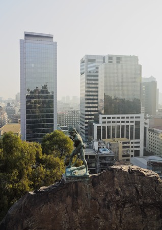 Chile, Santiago, Cityscape and Indian Monument viewed from the Santa Lucia Hill.