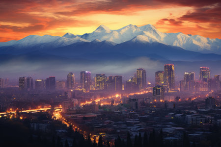 Beautiful sunset in the city with mountains and skyscrapers, Evening panorama of Santiago de Chile, AI Generated