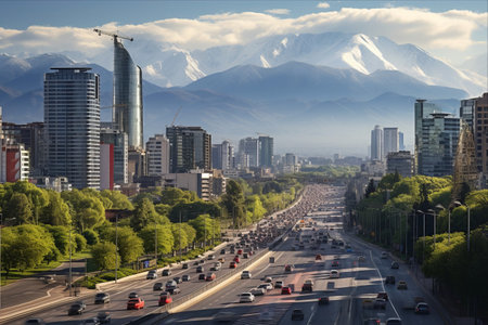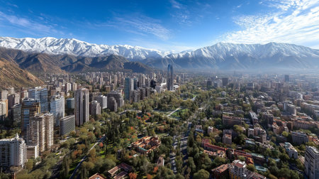 A vibrant panoramic view of Santiago, Chile, showcasing modern skyscrapers, historic buildings, and bustling streets beneath a bright blue sky with the majestic Andes as a backdrop.