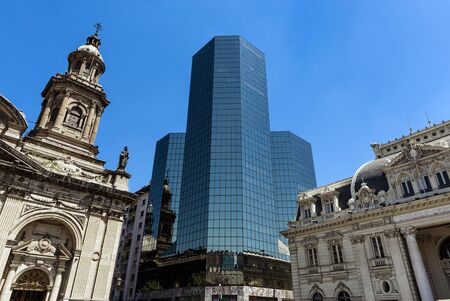 Santiago cathedral and the windows of a modern glass and steel office building in Santiago, Chile, South America