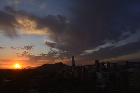 Cloudy sunset over Santiago with buildings and costenera center from the window