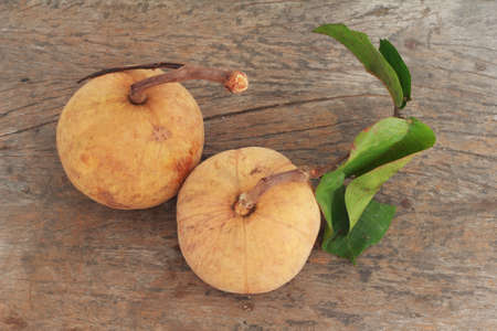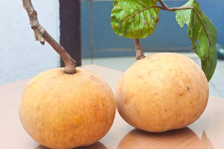 fresh sapodilla fruits on old wooden background. tropical fruits concept