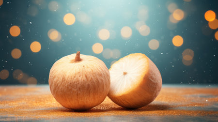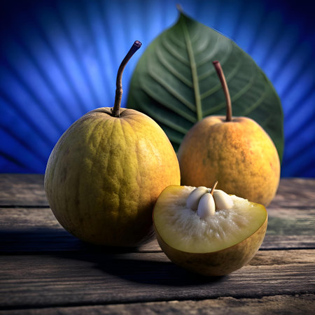A 3D rendered image of a santol fruit. cut open to reveal its juicy. white flesh and seeds. The fruit is sitting on a rustic wooden table. with a leaf in the background. Perfect for food blogs. culinary articles. or educational materials.