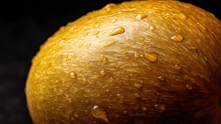 This close-up image captures the rich texture of a golden fruit, accentuated by glistening water drops, epitomizing freshness and nature's bounty.