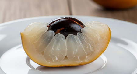 The santol fruit, cut in half, has a sour rind, sweet granules are placed in a plate.