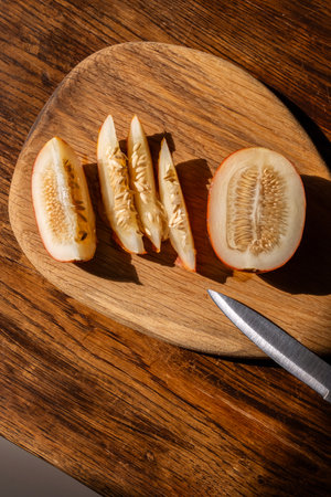 Freshly sliced melon fruit on wooden cutting board.