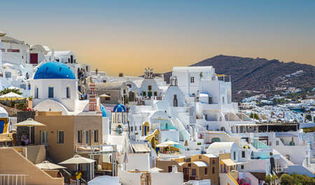 Cityscape of Oia town in Santorini island, Greece. Panoramic view at the sunset.