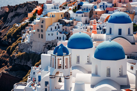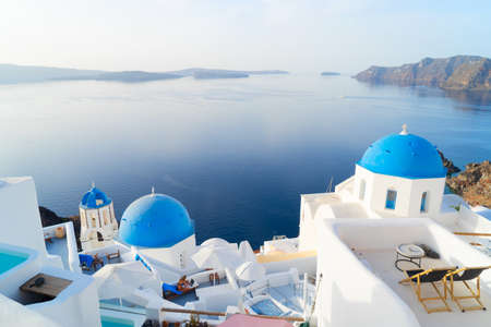 Oia town on Santorini island, Greece. View of traditional white houses and churches with blue domes over the Caldera, Aegean sea