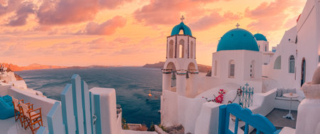 Panoramic Europe summer destination. Traveling sunset famous landscape Santorini island, Oia, Greece. Caldera colorful clouds, dream cityscape. Vacation panorama, amazing scene