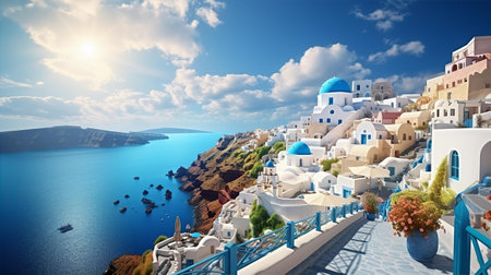 Generative AI illustration of streets and white houses with blue roofs of Santorini in Greece on a sunny day. Typical Mediterranean construction. Holidaysblue roofs of Santorini in Greece on a sunny day. Typical Mediterranean construction. Holidays