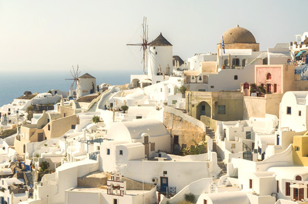 Beautiful Santorini in Greece - traditional windmill and apartments in Oia village on a sunny day. This image is toned.
