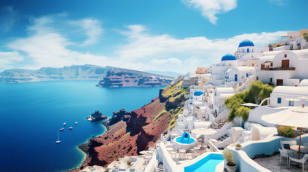 Picturesque santorini with white architecture under a clear blue sky, ideal for travel promotion and postcards. A.I.