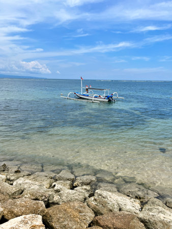 NUSA DUA, BALI, INDONESIA-SPRING, 2020: Seascape, fishing boat in the ocean. Atmospheric photo from a trip to the island of Bali. Travel to Asia. Soft focus. Traditional balinese fishing boat.