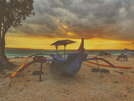 Ancient traditional Jukung fishing boat on seashore at colorful sunrise. Sanur beach, Bali, Indonesia