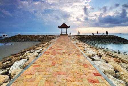 road of stone leads to a Pavilion to rest. Beautiful morning at Karang beach, Sanur in Bali, Indonesia. Dawn
