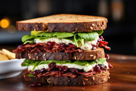 a stacked sandwich with cranberries and lettuce on rye bread, created with generative ai