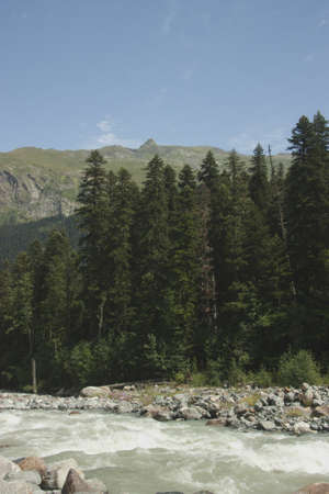 Mountain summer landscape with forest and high peaks. Caucasus. A view of the main Caucasian ridge. Biosphere Reserve resort Dombay. The concept of travel and tourism.