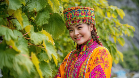 A young woman stands amidst lush green leaves, wearing a bright traditional costume that showcases cultural heritage. Her joyful smile adds warmth to the scenic background.