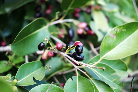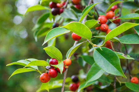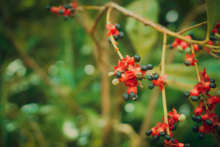 closeup the bunch black red curry tree fruit with leaves and plant in the forest soft focus natural green brown background.
